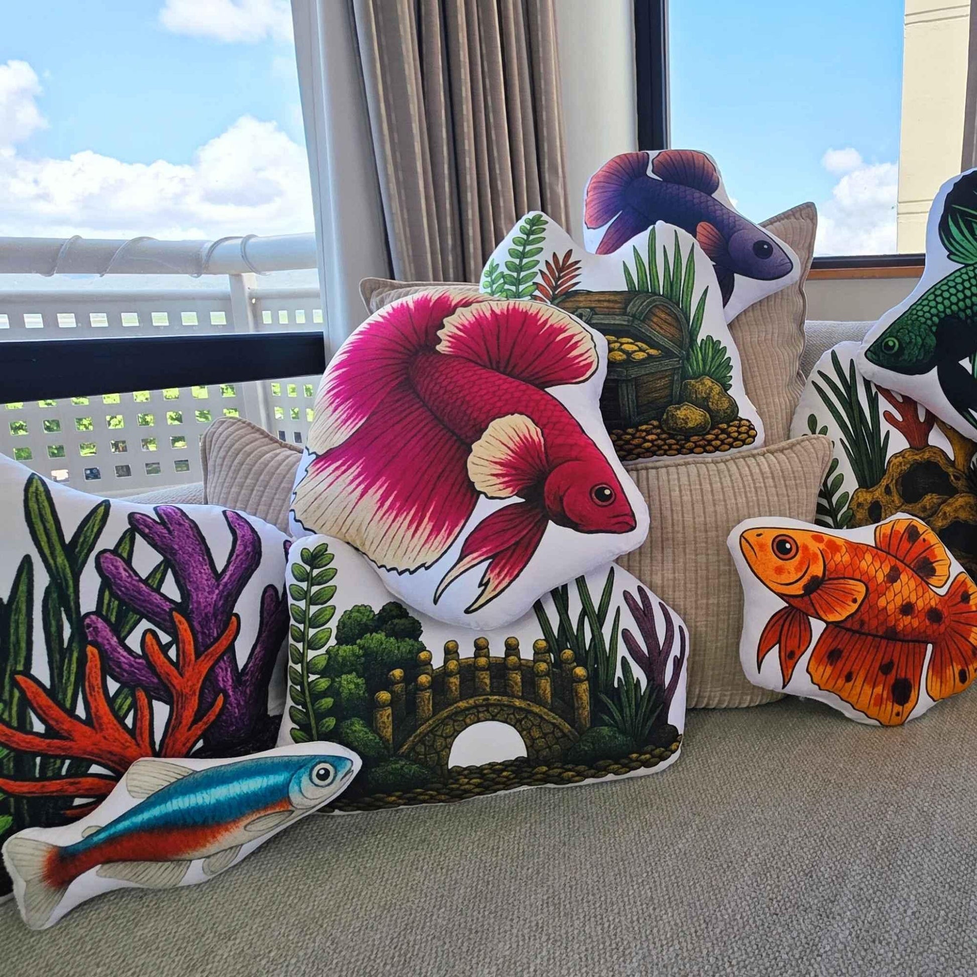 Add a bold splash of character to your space with this sculptural Longfin betta fish cushion. Printed in high-resolution on soft, durable polyester, each piece features FAWNE’s signature vintage illustration style and is shaped to match the flowing silhouette of the iconic Longfin fighting fish. Double-sided with a mirrored print and soft poly-cotton filling, this limited-edition cushion is part of the Betta Friends capsule collection.