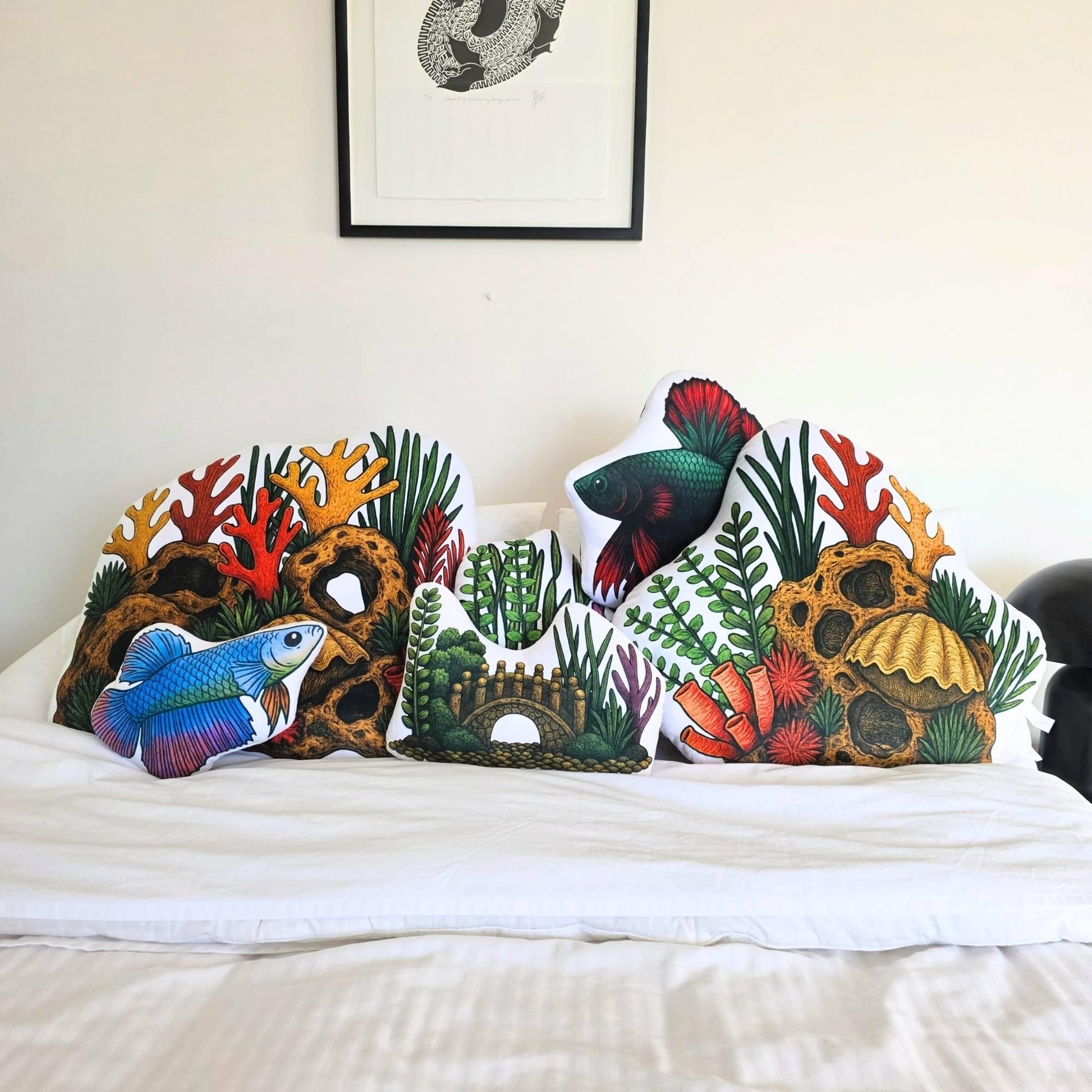 Add a bold splash of character to your space with this sculptural Longfin betta fish cushion. Printed in high-resolution on soft, durable polyester, each piece features FAWNE’s signature vintage illustration style and is shaped to match the flowing silhouette of the iconic Longfin fighting fish. Double-sided with a mirrored print and soft poly-cotton filling, this limited-edition cushion is part of the Betta Friends capsule collection.