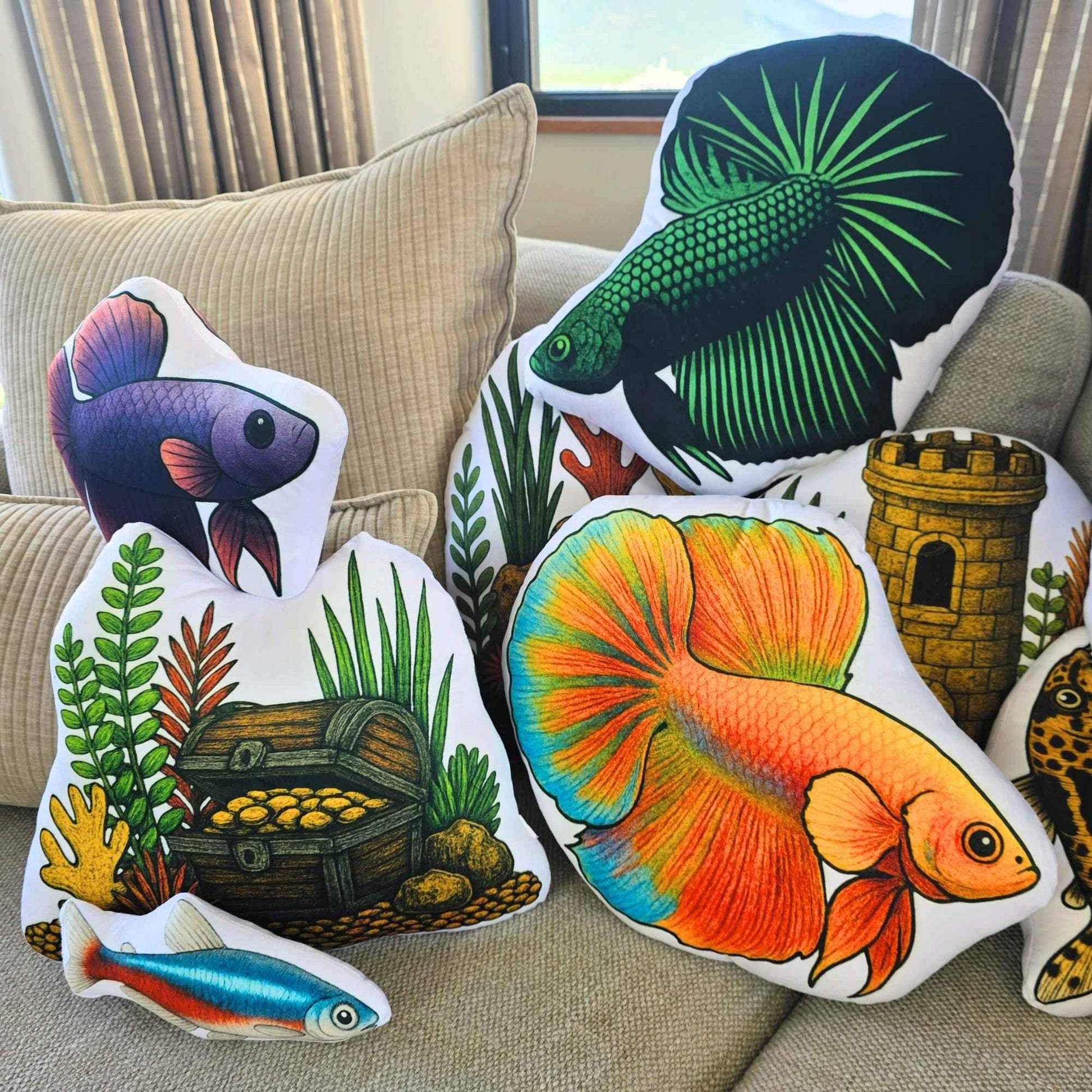 Celebrate the quiet beauty of the shortfin betta with this sculptural 30cm cushion. Printed in high-resolution on soft, durable polyester, it features FAWNE’s signature vintage illustration style and a gentle, rounded silhouette inspired by the graceful form of the shortfin fighting fish. Double-sided with a mirrored print and soft poly-cotton filling, this small-batch cushion is part of the Betta Friends capsule collection.