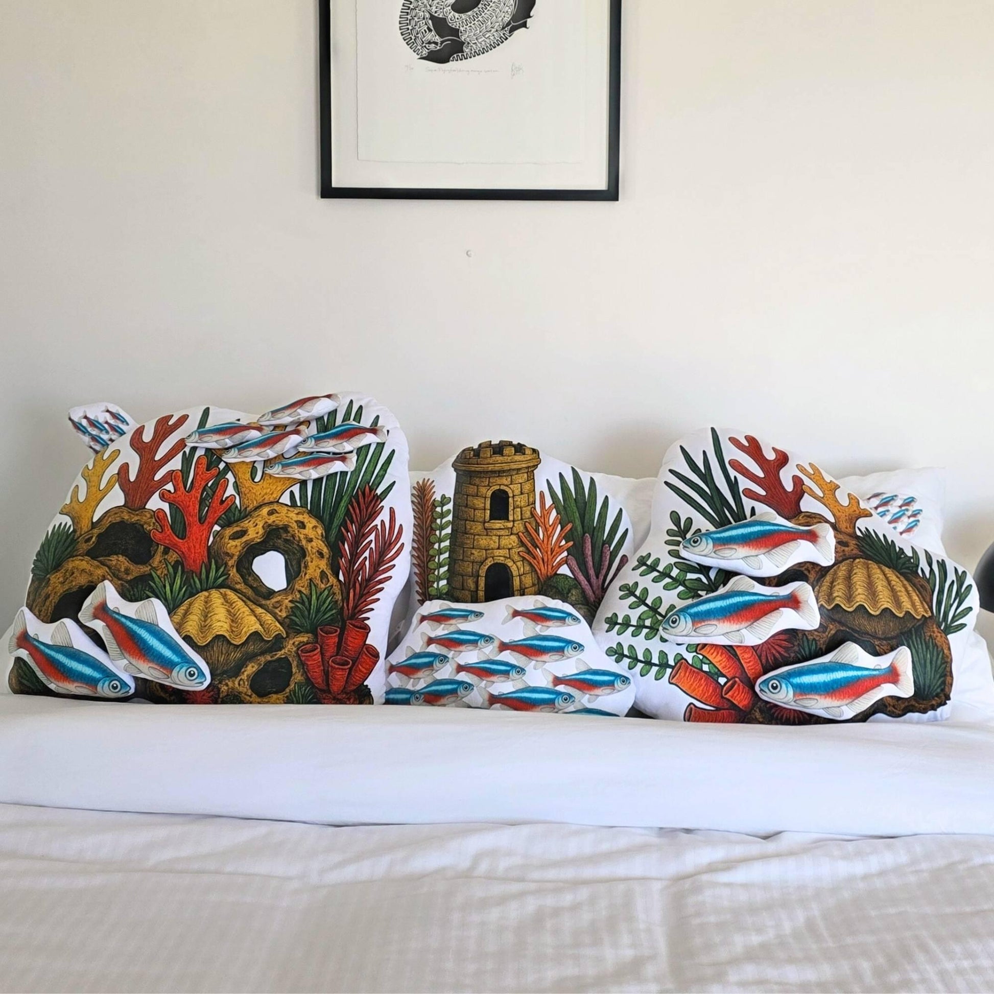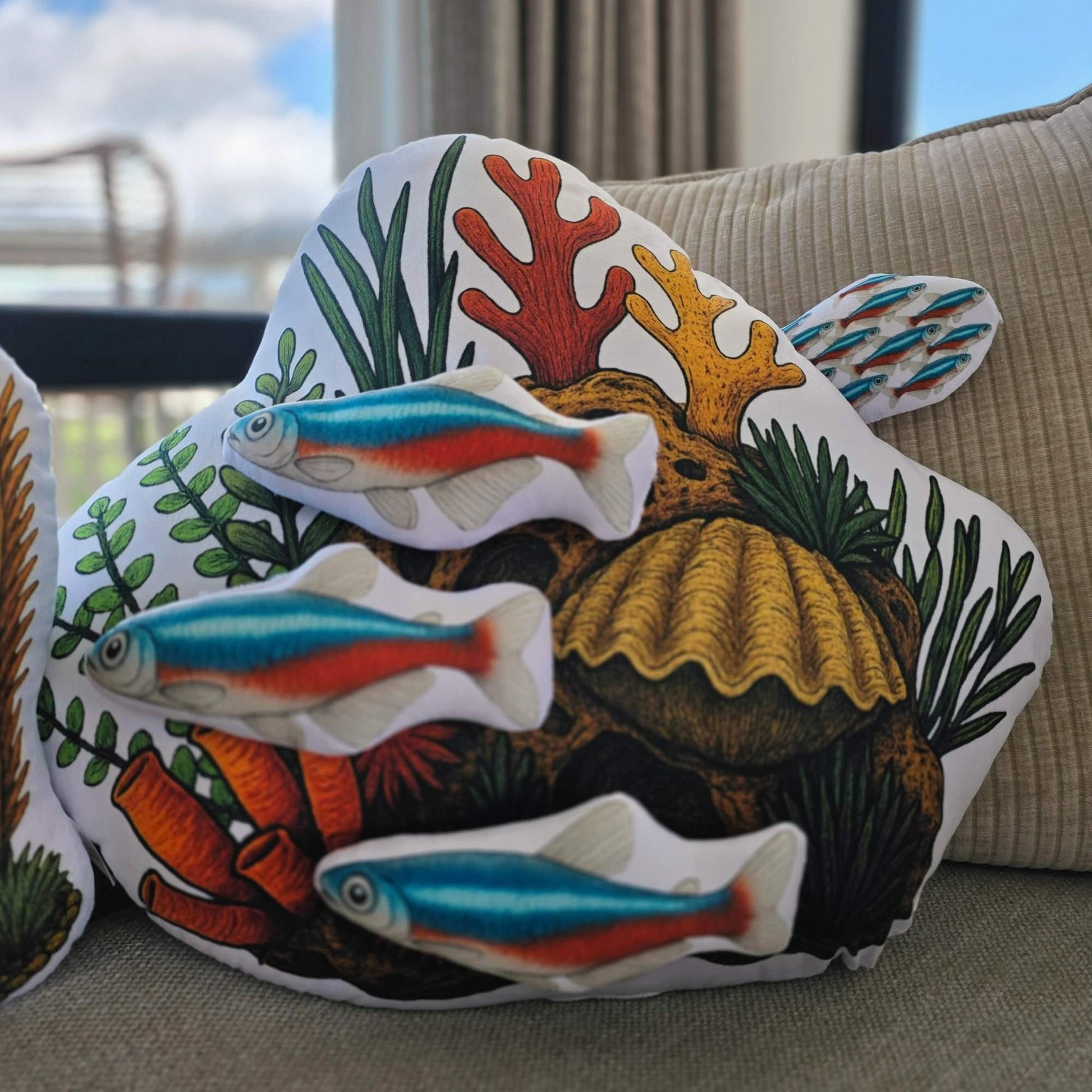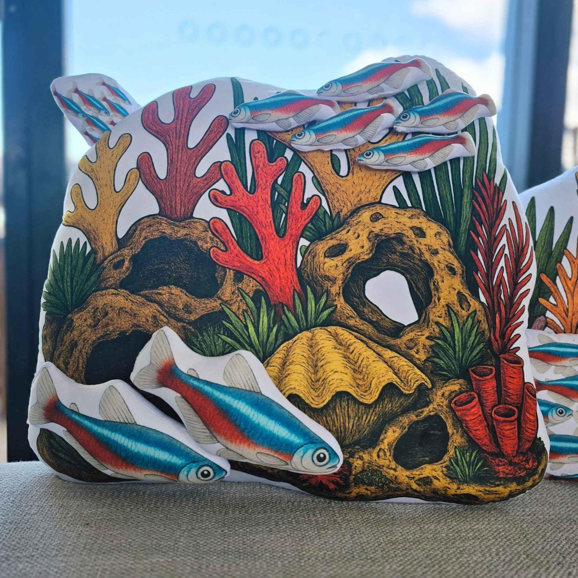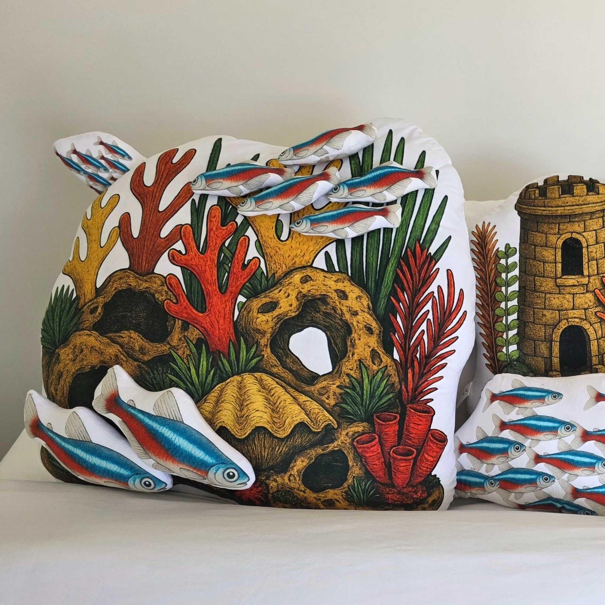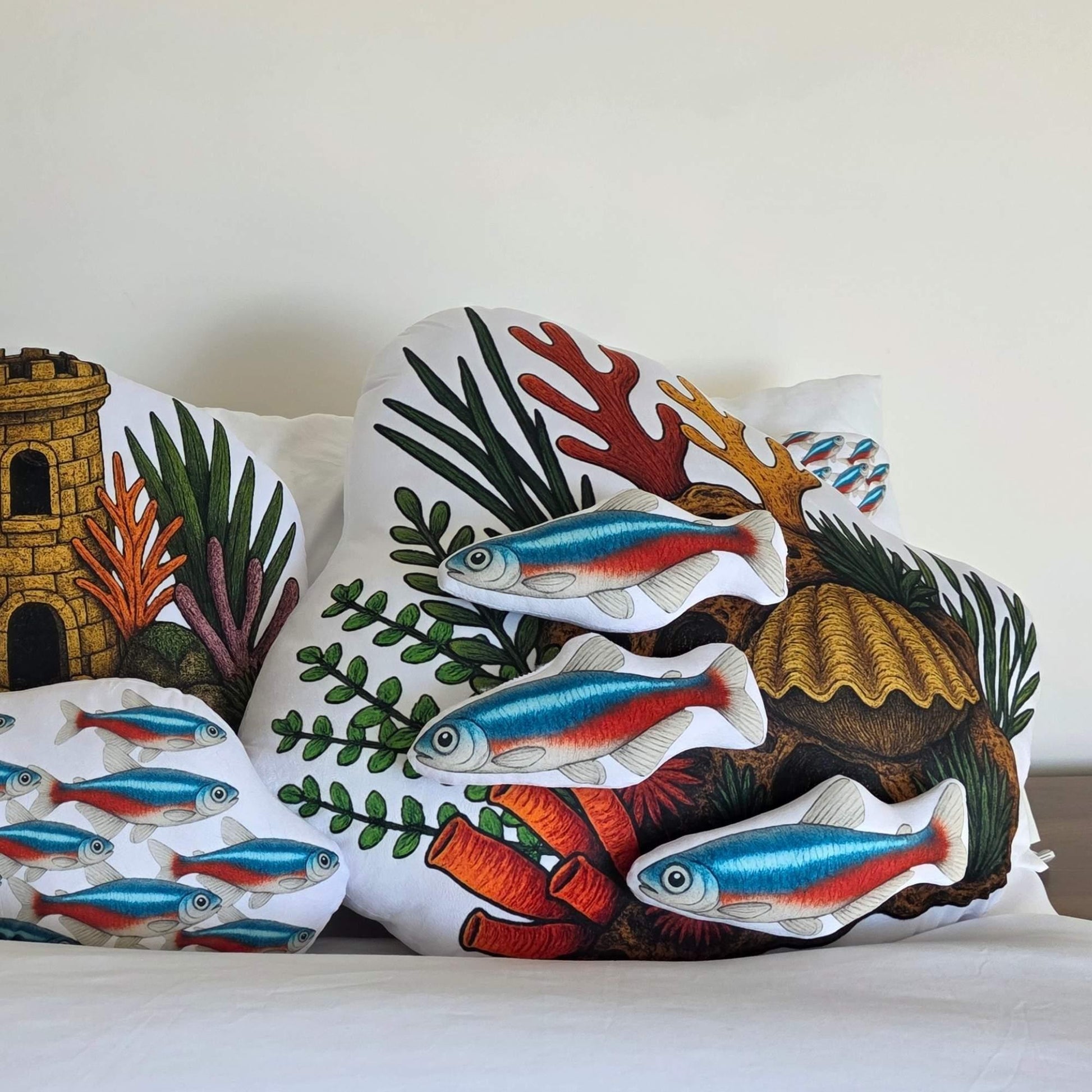 Bring an underwater daydream to life with this limited-edition cushion set inspired by lush aquascapes and shimmering neon tetras. Each piece is illustrated with FAWNE’s signature vibrant detail, layering coral textures, plants, and schooling fish to create a cozy 3D underwater world for your lounge, studio, or bedroom.