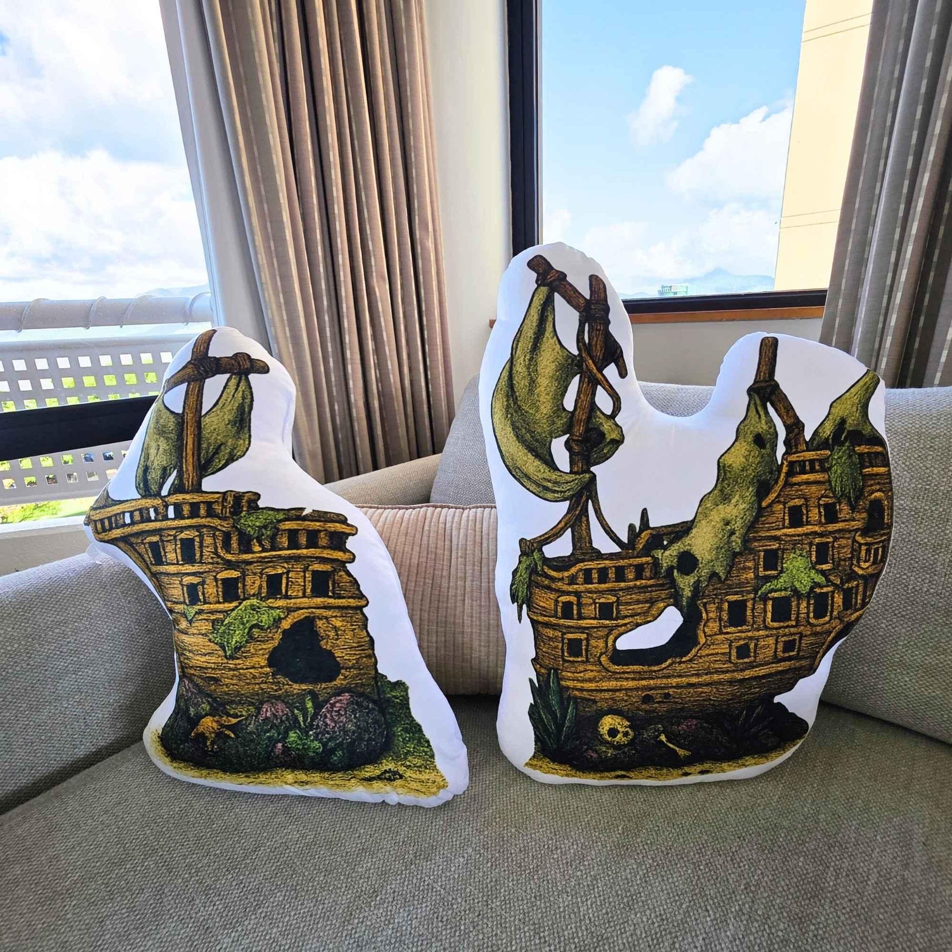 Explore the depths of comfort with this Sunken Pirate Ship shaped cushion set, Printed in high resolution on soft, durable fabric. Each cushion is designed with Fawne’s signature blend of vintage illustration detail and playful design.