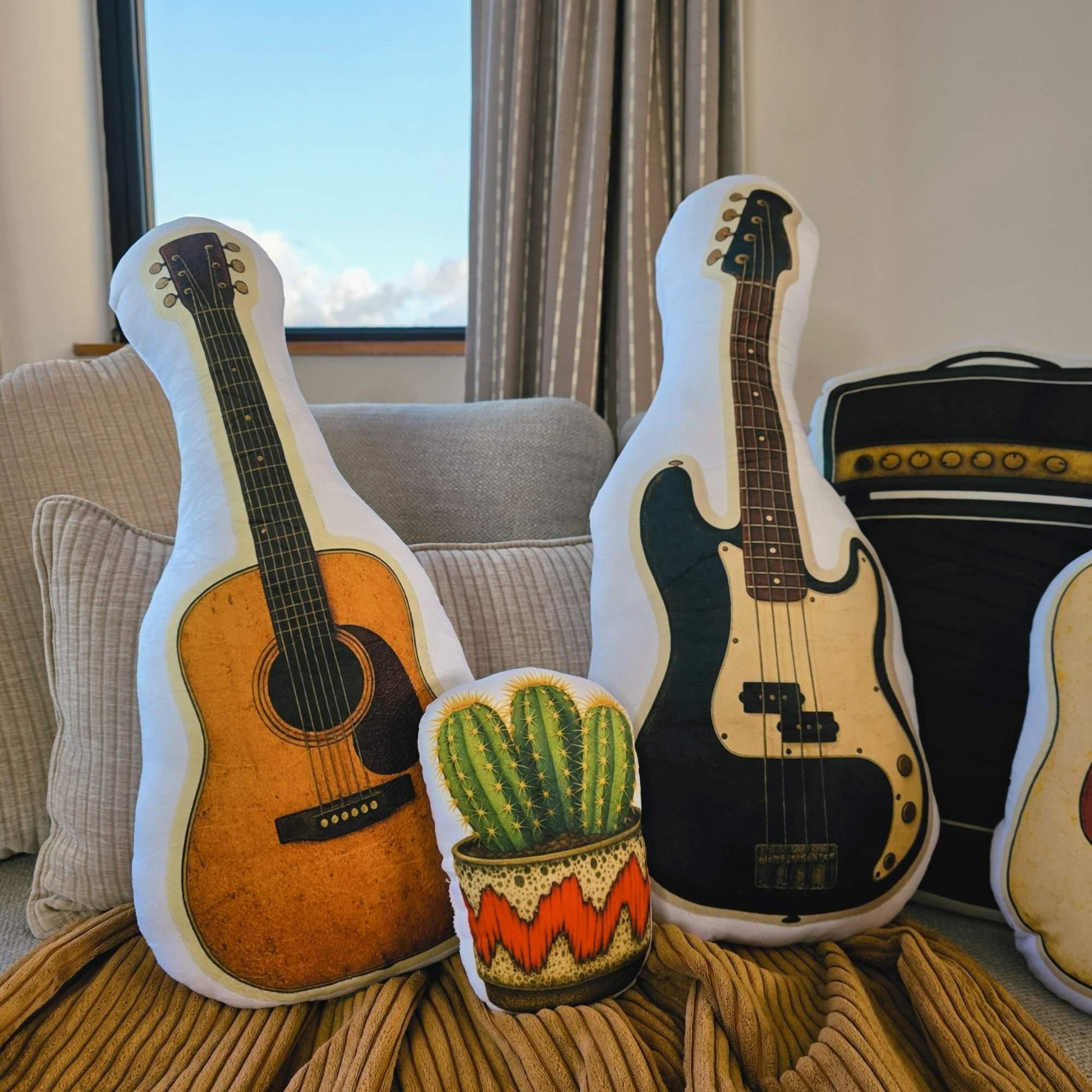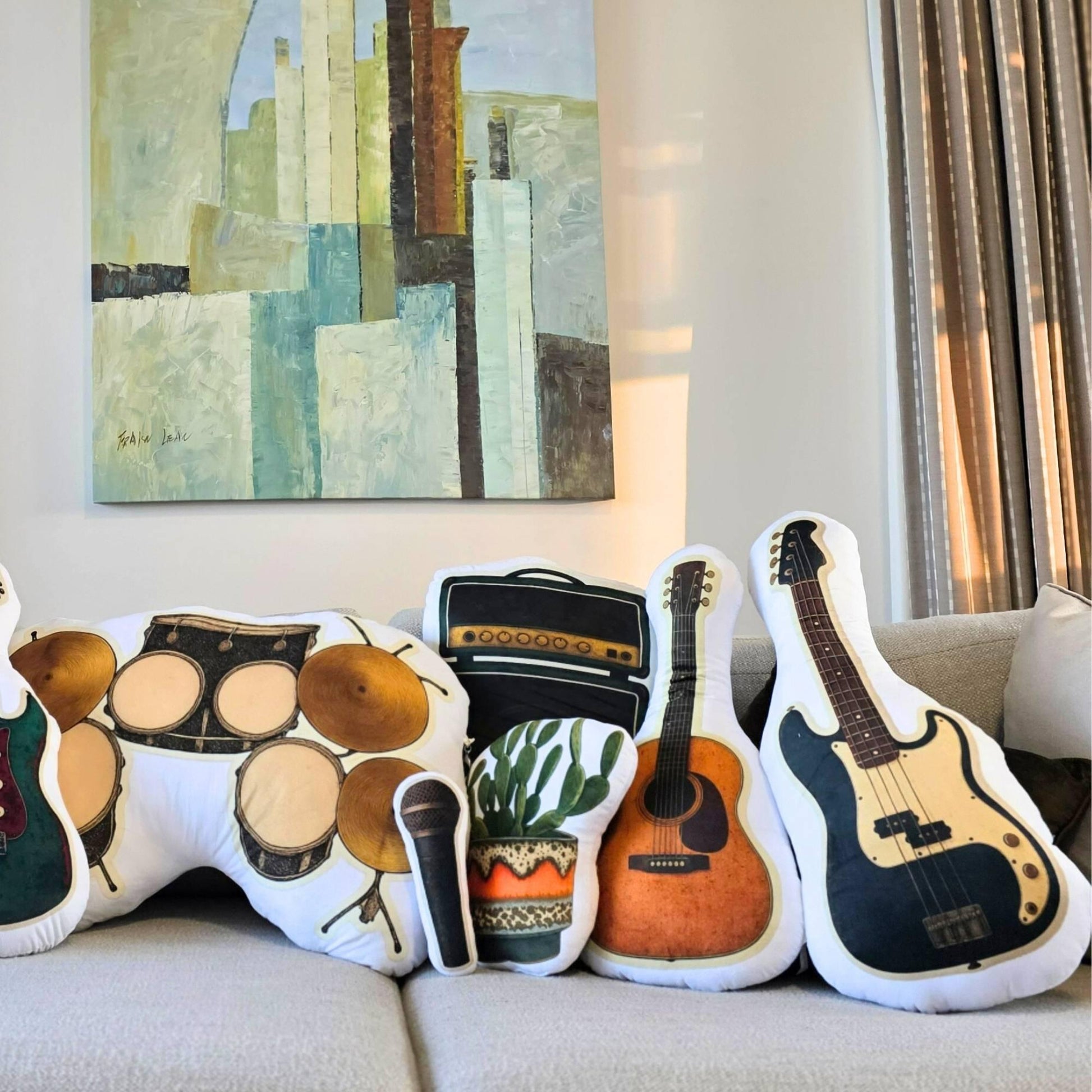 Turn up the comfort. Each Setlist cushion is shaped to match the iconic silhouette of its instrument, illustrated with textured, retro-warm detailing. Soft, durable, and sized for the perfect couch companion — whether you're on the sofa, in the studio, or drifting into daydreams backstage.