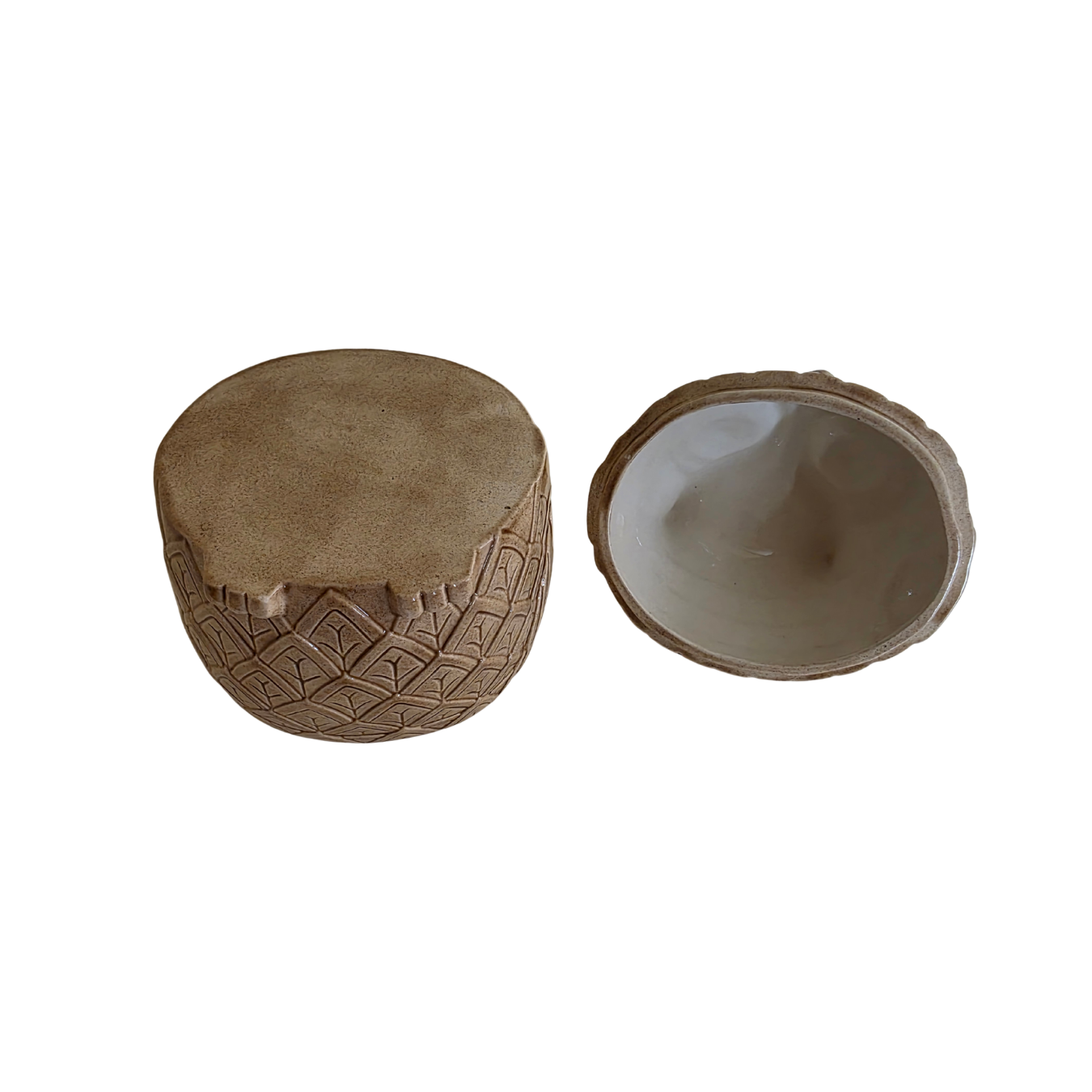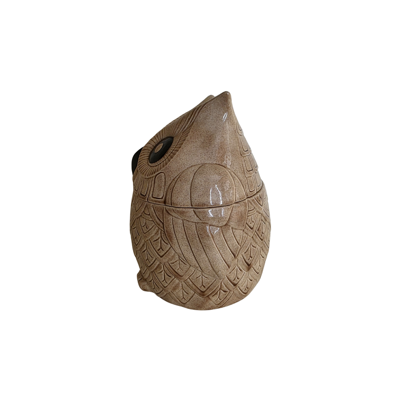 A beautifully crafted ceramic owl cookie jar with expressive hand-painted features and a warm textured glaze. This charming piece reflects the characterful Japanese ceramic style of the mid-century era. In excellent vintage condition, it’s a whimsical yet collectible addition to any kitchen or display.