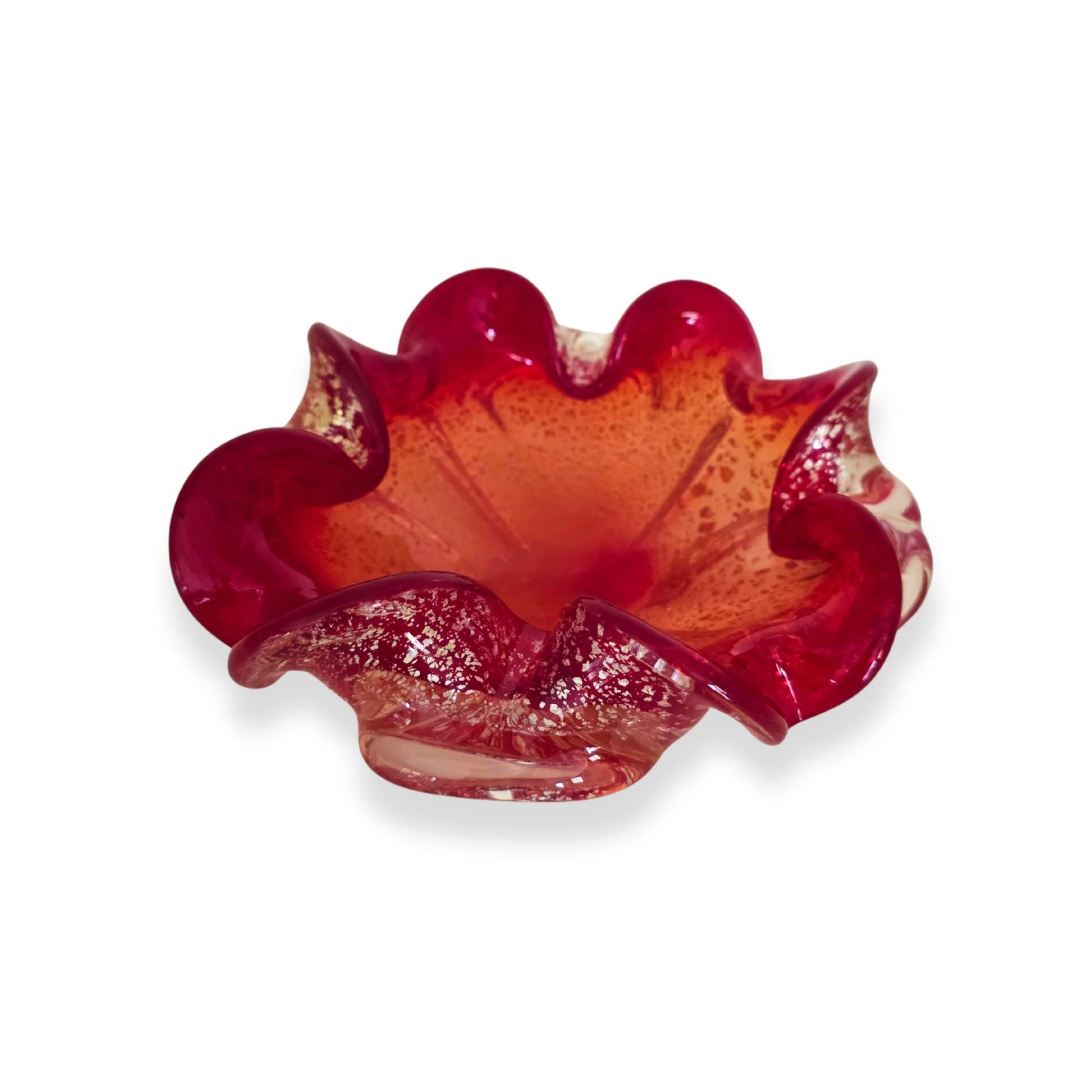A striking vintage Murano bowl glowing with ruby tones and shimmering gold flecks, crafted with unmistakable mid-century charm. A radiant centrepiece that brings warmth, artistry, and quiet luxury to any space.